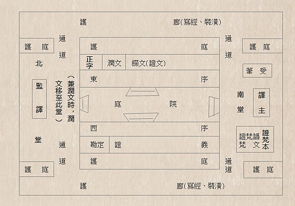 譯經院由三堂組成,中央為「譯經堂」,東序為「潤文堂」,西序為「證譯堂」。每堂各有精密的分工: