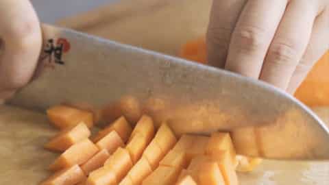 備料:蘑菇稍微清洗瀝乾切厚片,一顆約切4片。洋蔥、去皮紅蘿蔔、芹菜、去皮蕃薯切丁,大蒜切碎。羽衣甘藍去掉尾端的粗梗,切碎。