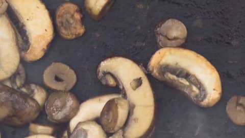 鍋子中大火預熱,加點橄欖油,下蘑菇煎香直到表面呈現金黃色。取出備用。