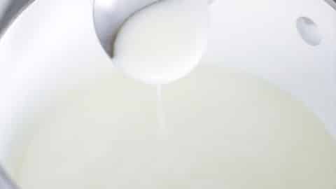 最後十分鐘的時候,來煮白醬。另外準備小鍋,開中小火,放入奶油融化後加入麵粉,用矽膠刮刀或木匙快速攪拌成泥狀,加熱約一分鐘,一邊攪拌一邊加入牛奶,煮成濃稠的白醬。